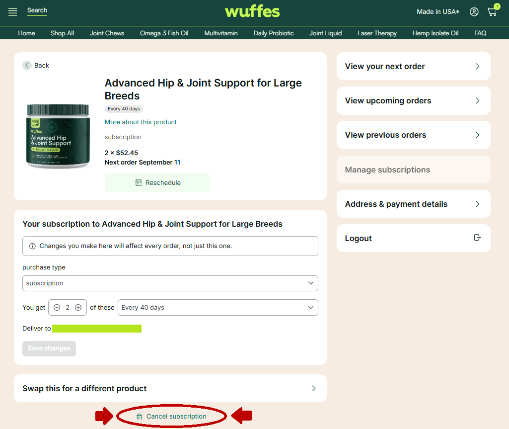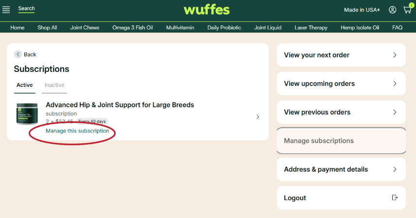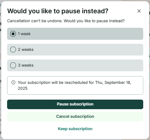 4. Click on the buttonĀ "Cancel Subscription" at the bottom of the page. On this page, you'll be given the option to briefly "Pause"Ā your subscription instead,Ā cancel your subscription completely, or go back and keep your subscription.