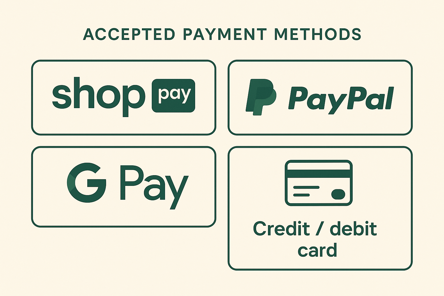 We offer quick-checkout options such as Shop Pay, PayPal and Google Pay, as well as direct payment with debit or credit card. The quick checkout options will use your saved information from any of these accounts, or you can input your information manually and choose your preferred payment method at checkout.