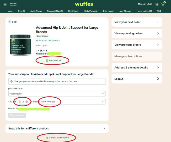 4. On this page, you will have the option to modify the subscription for this item. Whether you wish to reschedule your next order, modify the amount of items you'll receive on every order, or how often you'll receive your order, everything can be done on this page!.