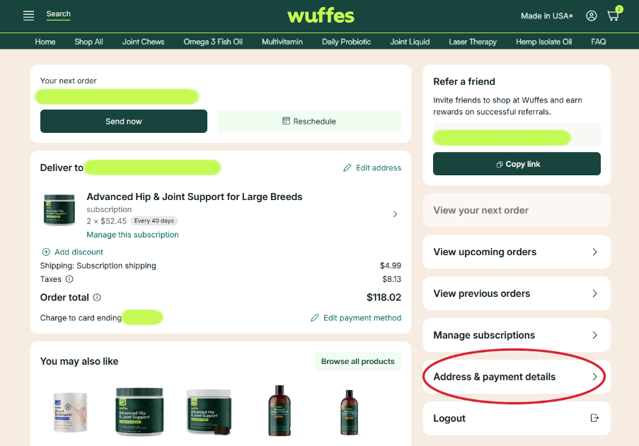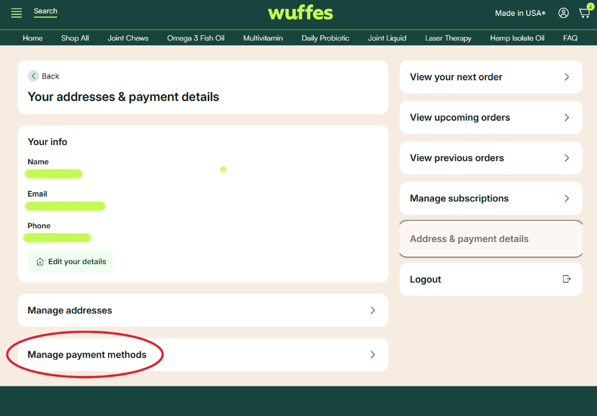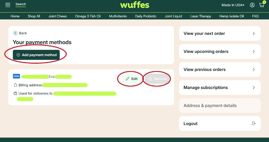 If you currently have an active subscription, please remember that the same payment method will be used for your all your future shipments. If you experience any issues managing your payment methods, you can always contact one of our specialists at 307-317-4913 for further assistance!